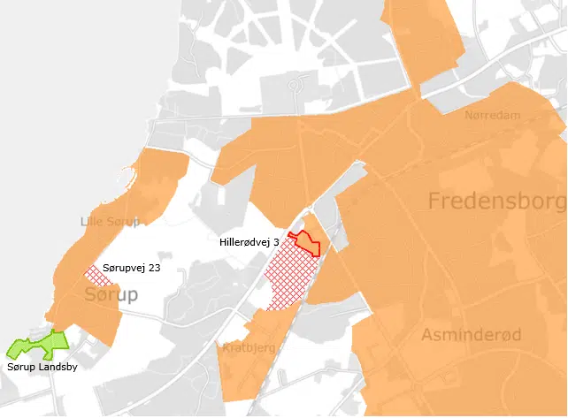 Nyt byudlæg (Sørupvej 23) og perspektivareal (Hillerødvej 3) til boliger fremgår af nedenstående kort.
